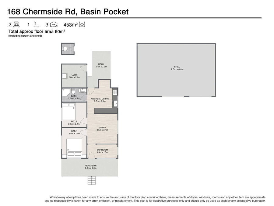 Beyond the bullnose front veranda is a great home office/study/kids lounge that then continues on to the air conditioned lounge area. High ceilings are found throughout the home as is 2 supersized bedrooms (1 with ceiling fan), and the approx 2 year young updated kitchen complete with a pantry/gas cooktop/microwave nook/fridge recess and a breakfast bar. This kitchen/dining area also opens out onto the shade sail covered rear deck. The good sized bathroom definitely does the job and even has a fancy laundry chute door that delivers the dirties right into the large separate laundry at the rear of the home. Speaking of rear...a 2nd loo is also found near the deck area and is perfect for when entertaining or doing whatever it is you do within an awesome shed.
