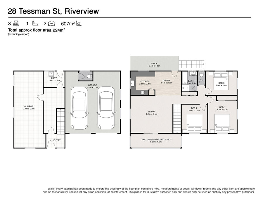 Bedrooms: 3 + study/kids lounge/sunroom